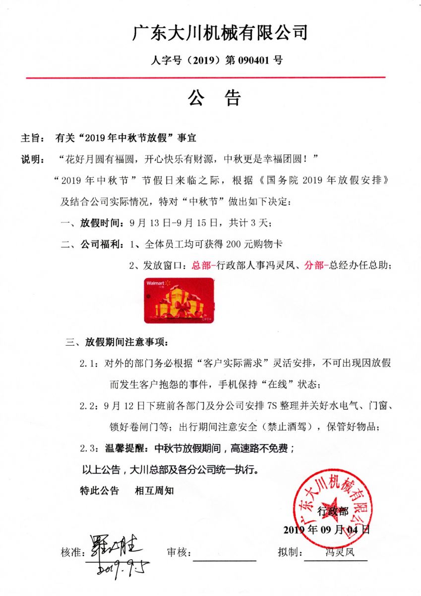廣東大川機(jī)械有限公司2019年中秋節(jié)放假 發(fā)布時(shí)間:2019/09/11